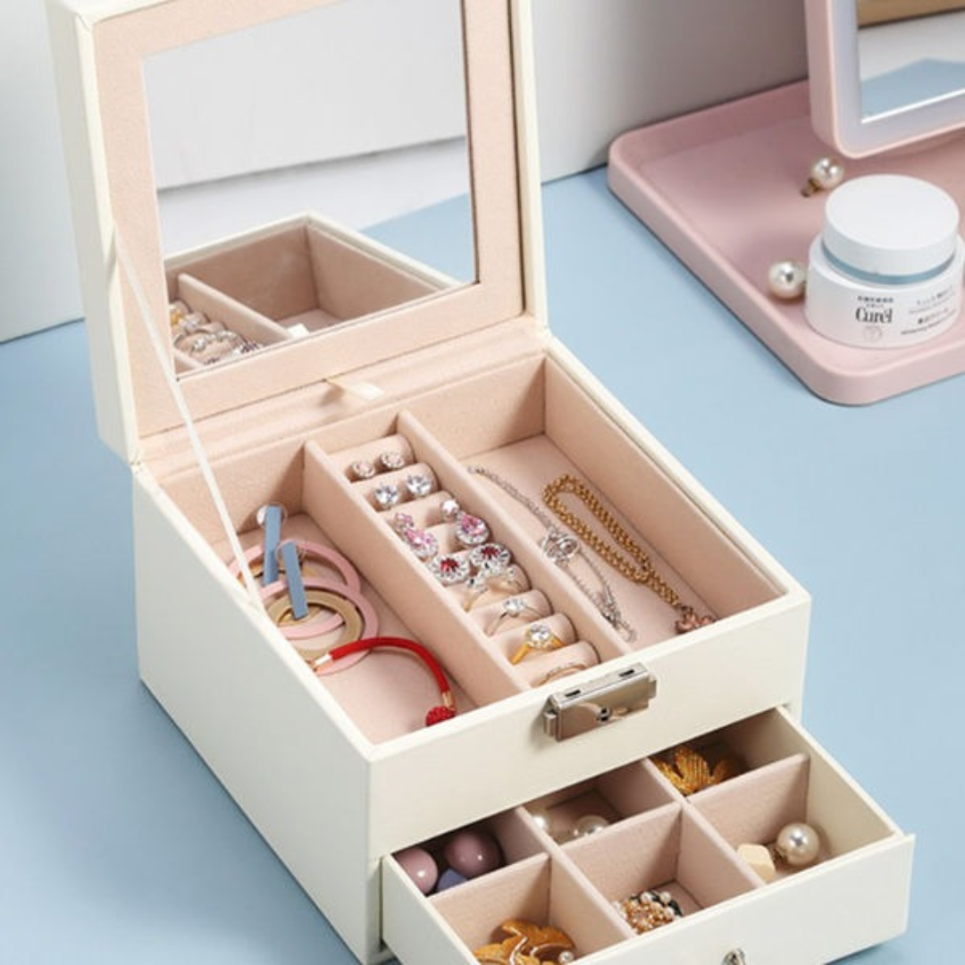 Multi Section Classic Holder with Modern drawer, Lock & Large Mirror Leather Jewelry Box Organizer for Women Teens Girls
