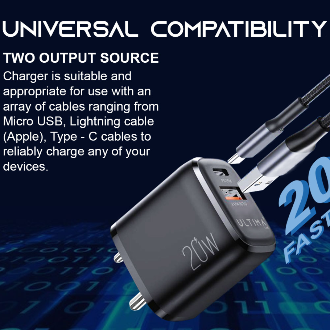 PD 3.0 & QC 3.0: Equipped with a 20W Power Delivery,3.0 port, and an 18W Quick Charge 3.0 port, the charger allows for charging two devices simultaneously